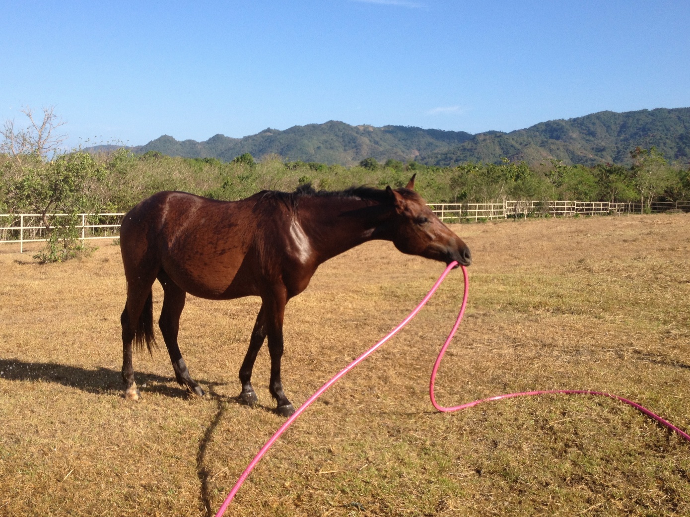 The horses tolerate the heat surprisingly well. They walk around their pasture to graze even in the middle of the day.