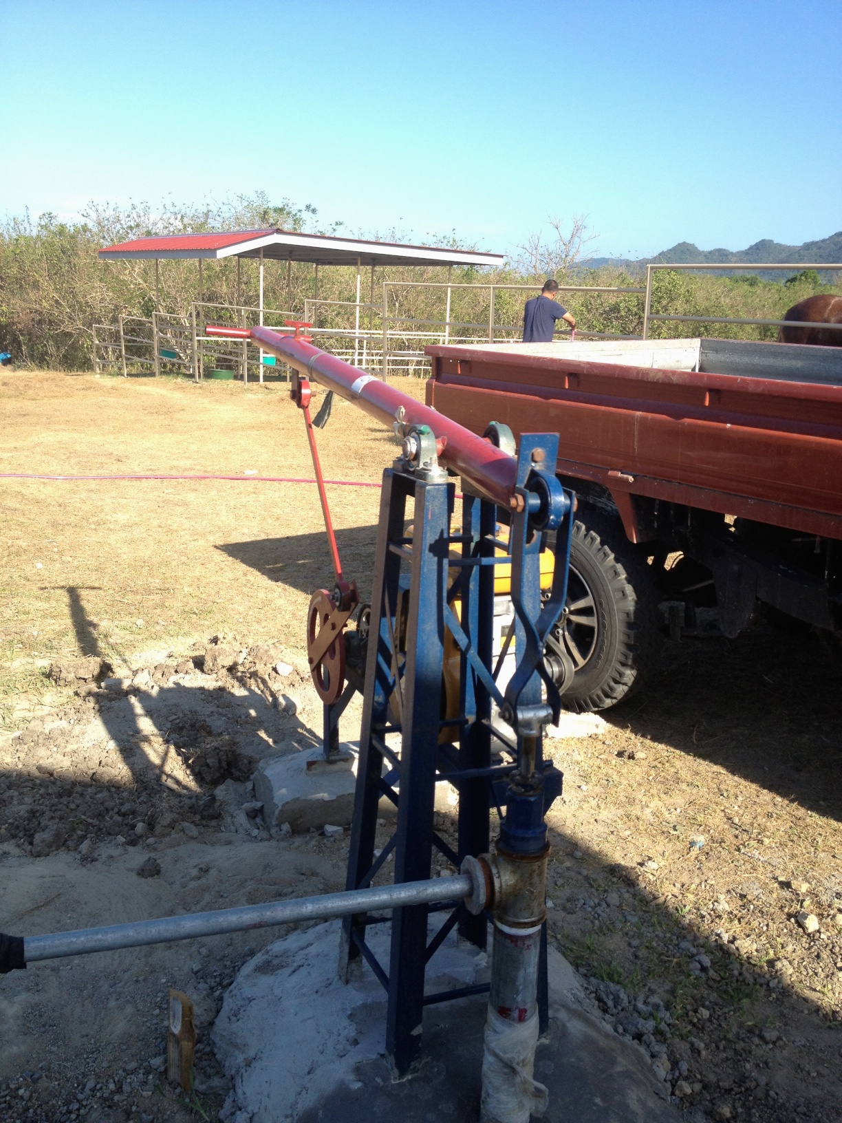 This is our water source for now. It’s called manumatic pump. There is a small motor that’s connected to a belt that’s connected to the handle of the pump. When you turn on the motor, you get running water! But, it doesn’t quite flow. It goes “whoosh-whoosh-whoosh”.