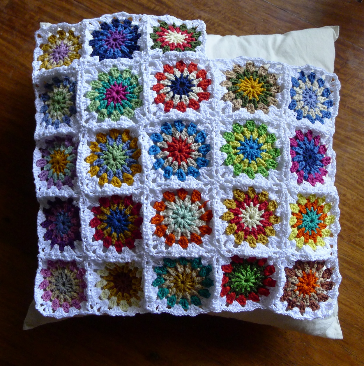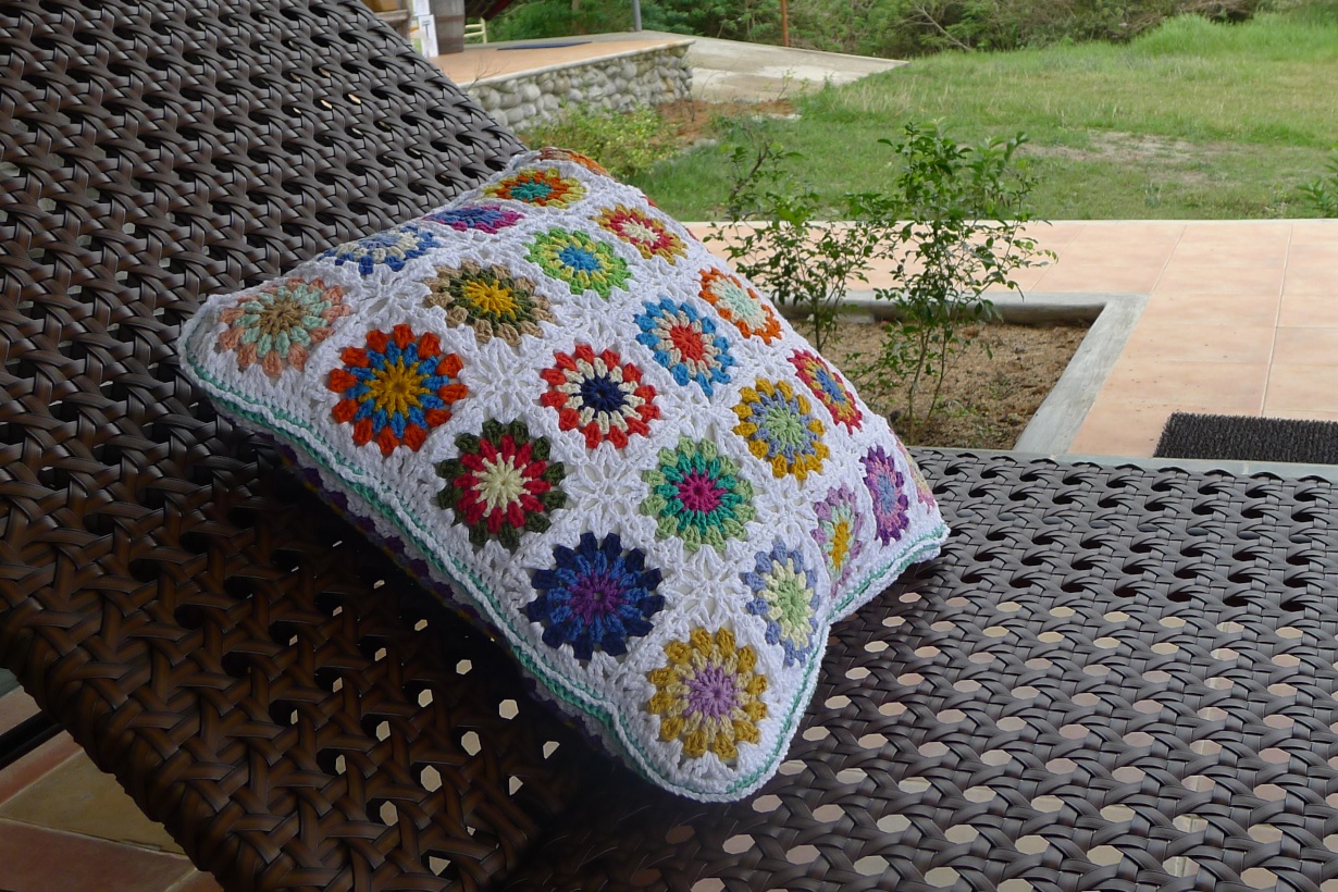 I really wanted a throw pillow for the veranda. But not just any throw pillow. I wanted something cheery and colorful. And I wanted to crochet it myself! This was going to be my biggest crochet project to date! I found a beautiful pattern online for a blanket. I love the name of the pattern — Flowers in the Snow. It is based on a traditional pattern called a granny square. Granny squares are made up of several rows of circles and one outer round that’s made with corners so it becomes a square. So its a circle in a square.