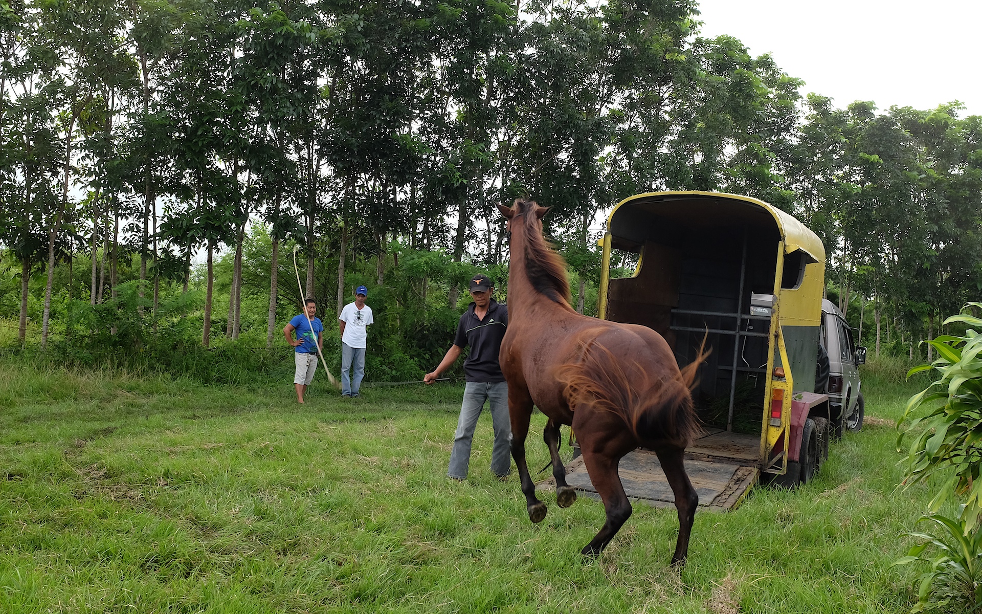 Takoy, calmly having his hooves trimmed while watching the trailer loading proceedings.