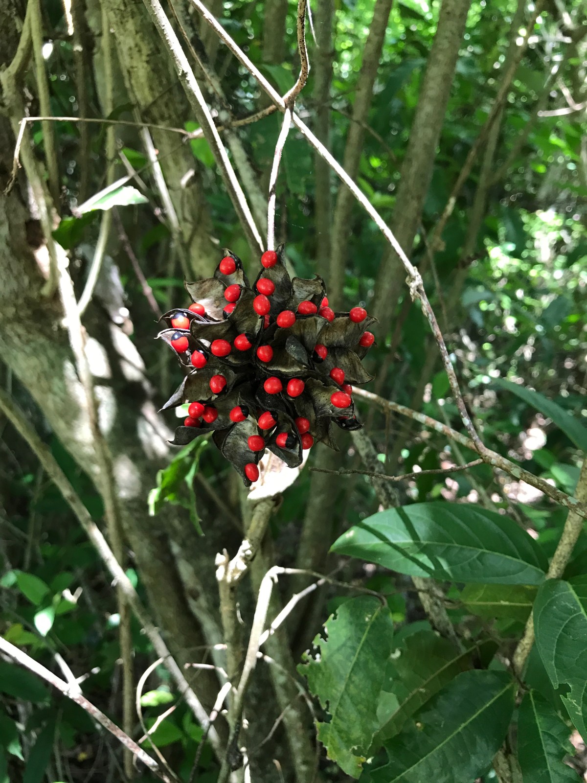 The seeds are very attractive and are made into bracelets or chokers as protection from bad spirits. The seeds are also toxic! Strange to think that bracelets made of toxic seeds are put on infants. The seeds contain the toxin abrin, a ribosome inhibitor. According to Trinket C, no need to remove the plant because “the toxin is only very potent when purified”.